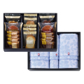 バニラ風味のプレーンケーキにメープルの風味が食欲をそそるメープルケーキ、ベルギー産の粒状砂糖「パールシュガー」を加え、食感にアクセントをつけた程よい甘さのプレーンワッフルとやわらかな生地にカリカリとした食感がアクセントのチョコレート風味のチョコワッフル、甘さを抑え軽い食感に仕上げたシュガーラスクや香ばしいココナッツの風味が広がるさくっとした食感のココナッツラスク、可愛らしい一口サイズの2種類のパイと今治タオルの詰合せです。