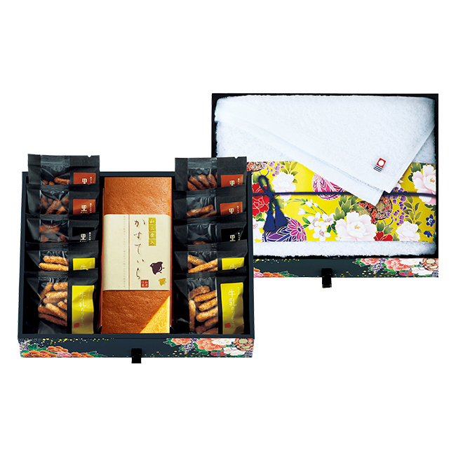 | 内容 | 和三盆糖入かすてぃら(プレーン)1本・かりんとう(黒糖×4・黒胡麻×2・牛乳×4)各15g・フェイスタオル340×750mm 賞味期限:製造日より常温で60日間 |