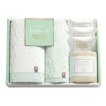 | 内容 | フェイスタオル(34×75cm)・ハンドタオル(34×34cm)・綿ボディタオル(30×95cm)・石けん3P(35g) |