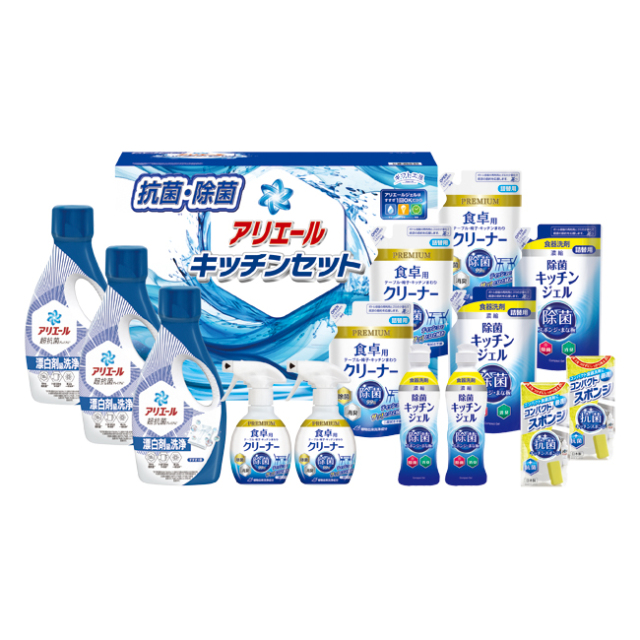 | 内容 | P&Gアリエールジェル700g・食卓用クリーナー(詰替)250ml×各3、除菌キッチンジェル200ml・除菌キッチンジェル(詰替)160ml・食卓用クリーナー260ml・コンパクトスポンジ×各2 |