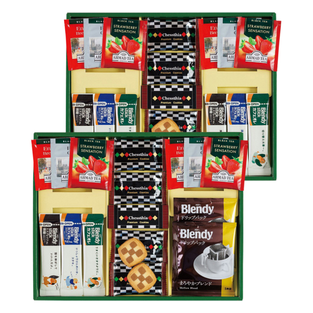 | 内容 | チェスティアクッキー×8、AGFブレンディコーヒードリップ式7g×2、紅茶(アールグレイ・イングリッシュブレックファースト・ストロベリー)2g×各4、AGFブレンディスティック(エスプレッソ・オレ5.8g・カフェオレカロリーハーフ5.4g・カフェオレ8.2g)×各3 賞味期限:製造日から180日 |