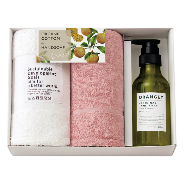 オレンジ&ハーブが爽やかに香る薬用ハンドソープと、オーガニックコットン100%のやさしいタオルのセット。
